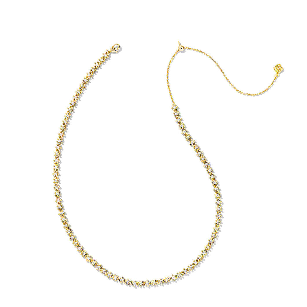 The Nydia Strand Necklace in Clear & Gold by Kendra Scott is an elevated everyday essential that adds a beautiful pop of sparkle. This collar necklace is made of high polish 18k gold plating adorned with crystals. It measures 14 inches with up to 5 additional inches.