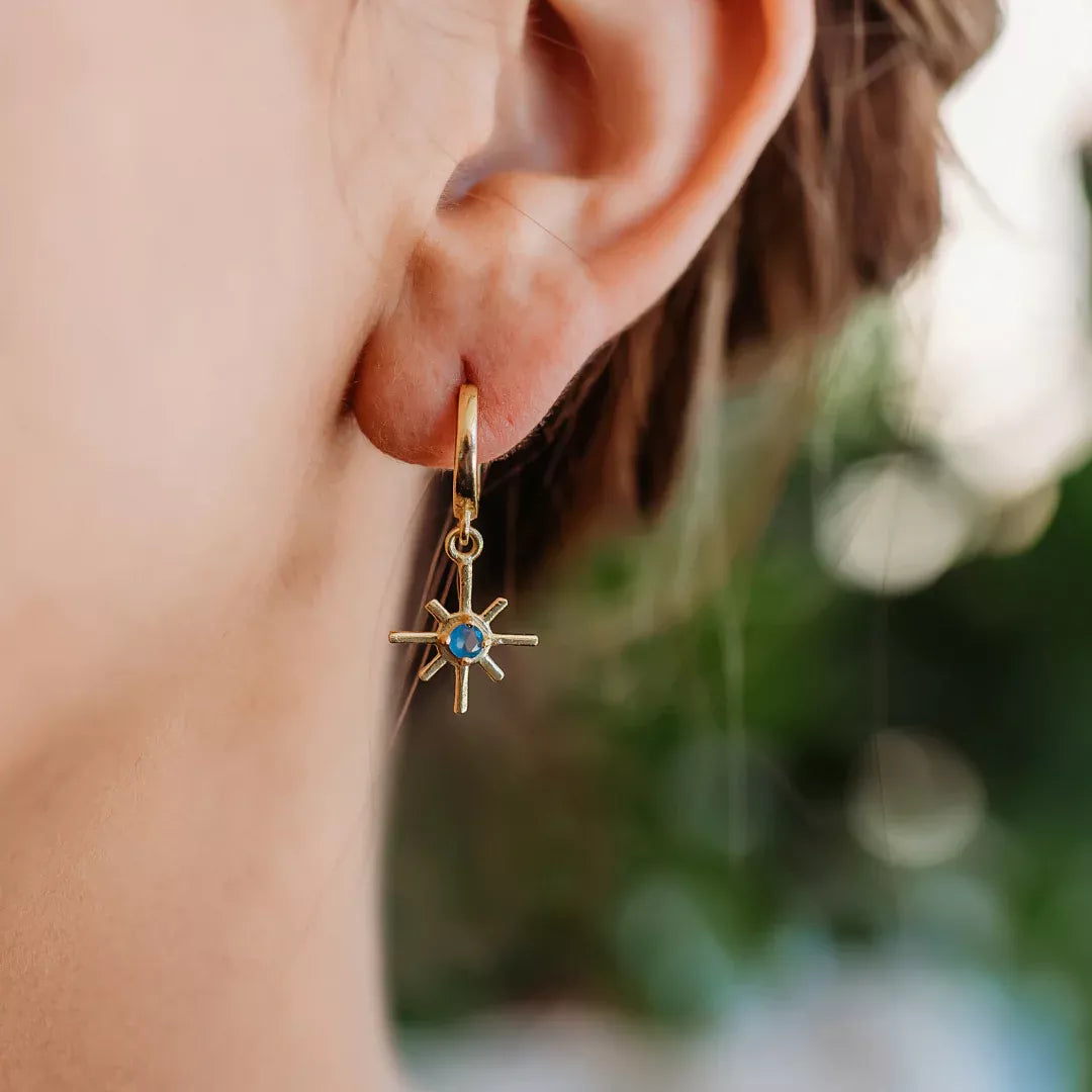 The Eclipse Huggies Blue Opal by Amorcito feature a celestial design with a beautiful pop of color. These earrings are made of high polish 18k gold plating and measure 13mm x 13mm dangling charm.