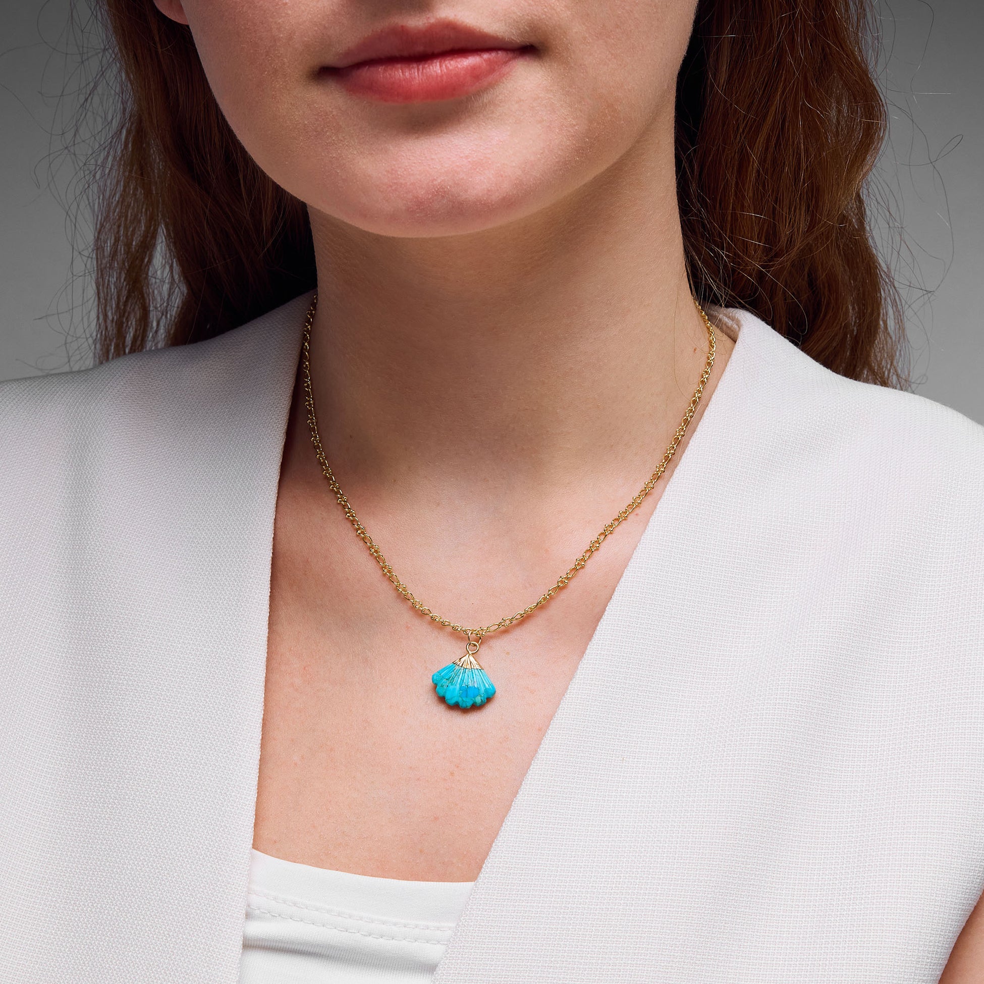 A sculptural shell pendant anchors this mixed-stone design, paired with a genuine turquoise charm. Finished in 14k gold-plated sterling silver, it’s a layered look in one—casual enough for daytime, polished enough for night.