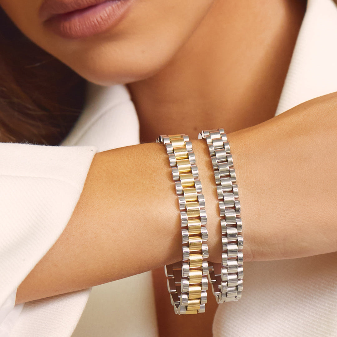 Two-toned, brushed metal timepiece bracelet. This bracelet is 0.4” (10mm) wide and comes in 2 lengths: Regular (6.9") and XS (6.4"). Metal foldover clasp closure.