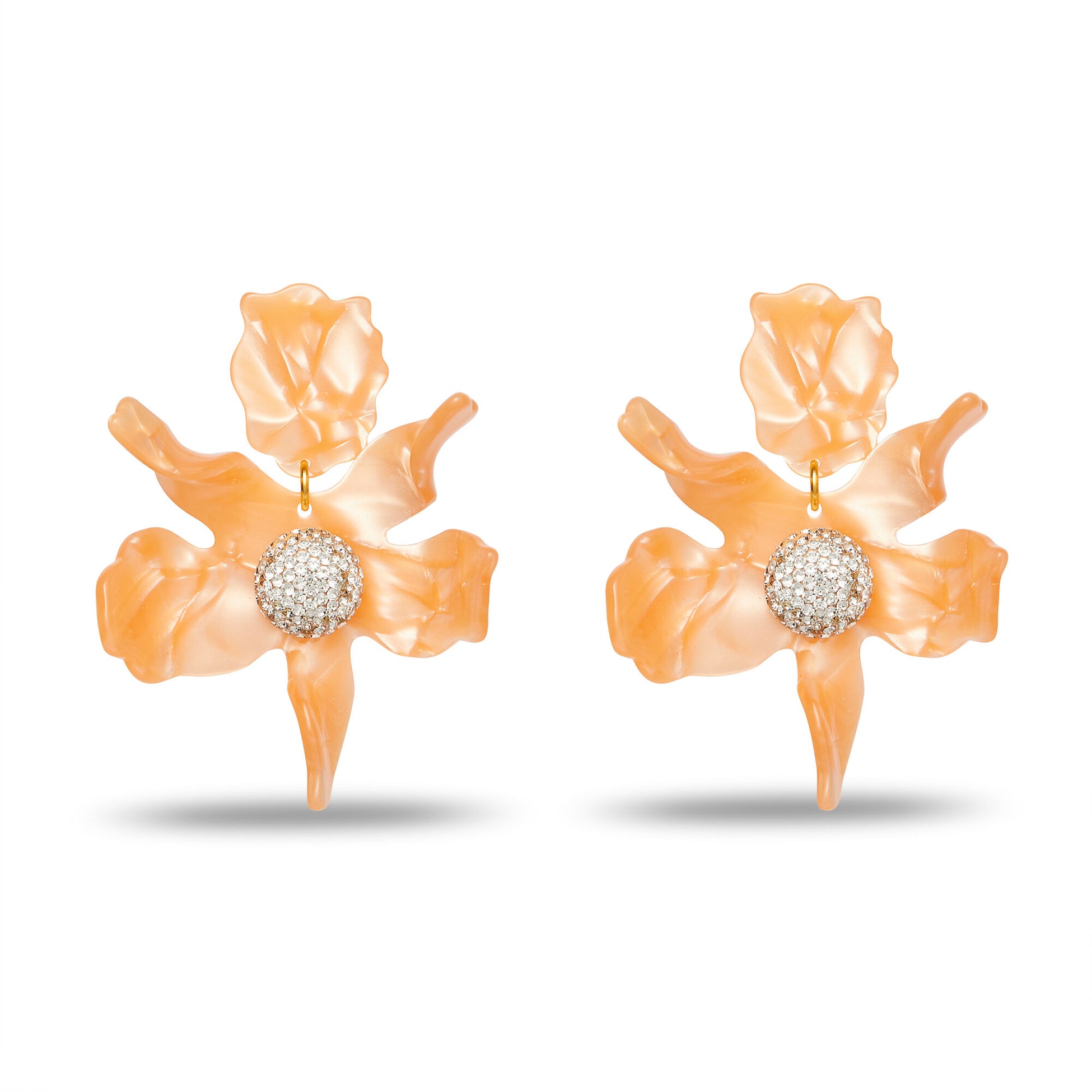 The Shell Pink Crystal Lily Earrings are earrings made of 14k gold-plating, measuring . These earrings feature a graceful lily design adorned with beautiful shell pink crystals, adding a touch of elegance and femininity to your look. Stainless steel post backs.