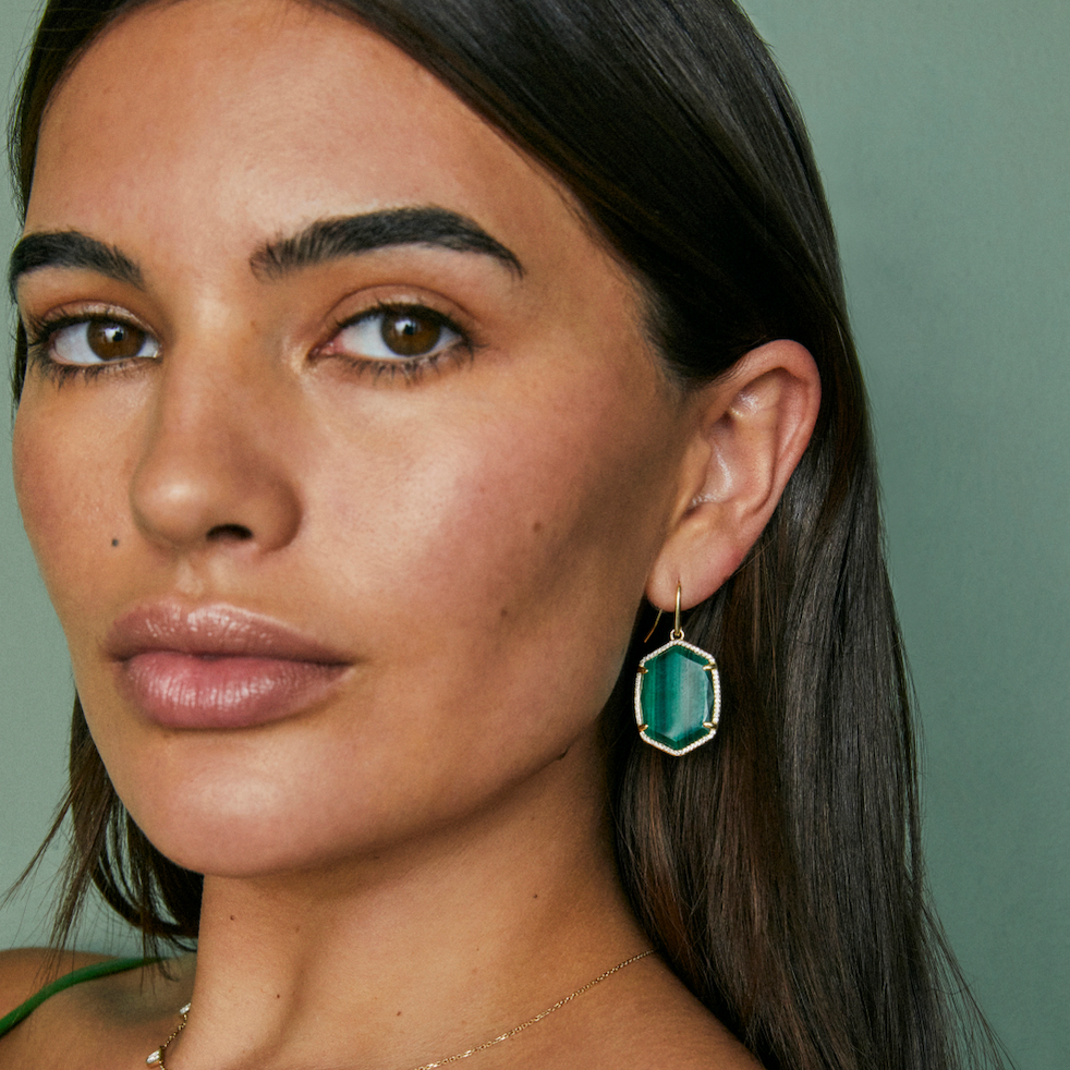 Your favorite drop earrings just got more glam. Featuring one of our signature stone shapes encased in a crystal-studded frame, the Daphne Gold Pave Frame Drop Earrings in Berry Mica will make a major statement with every wear.