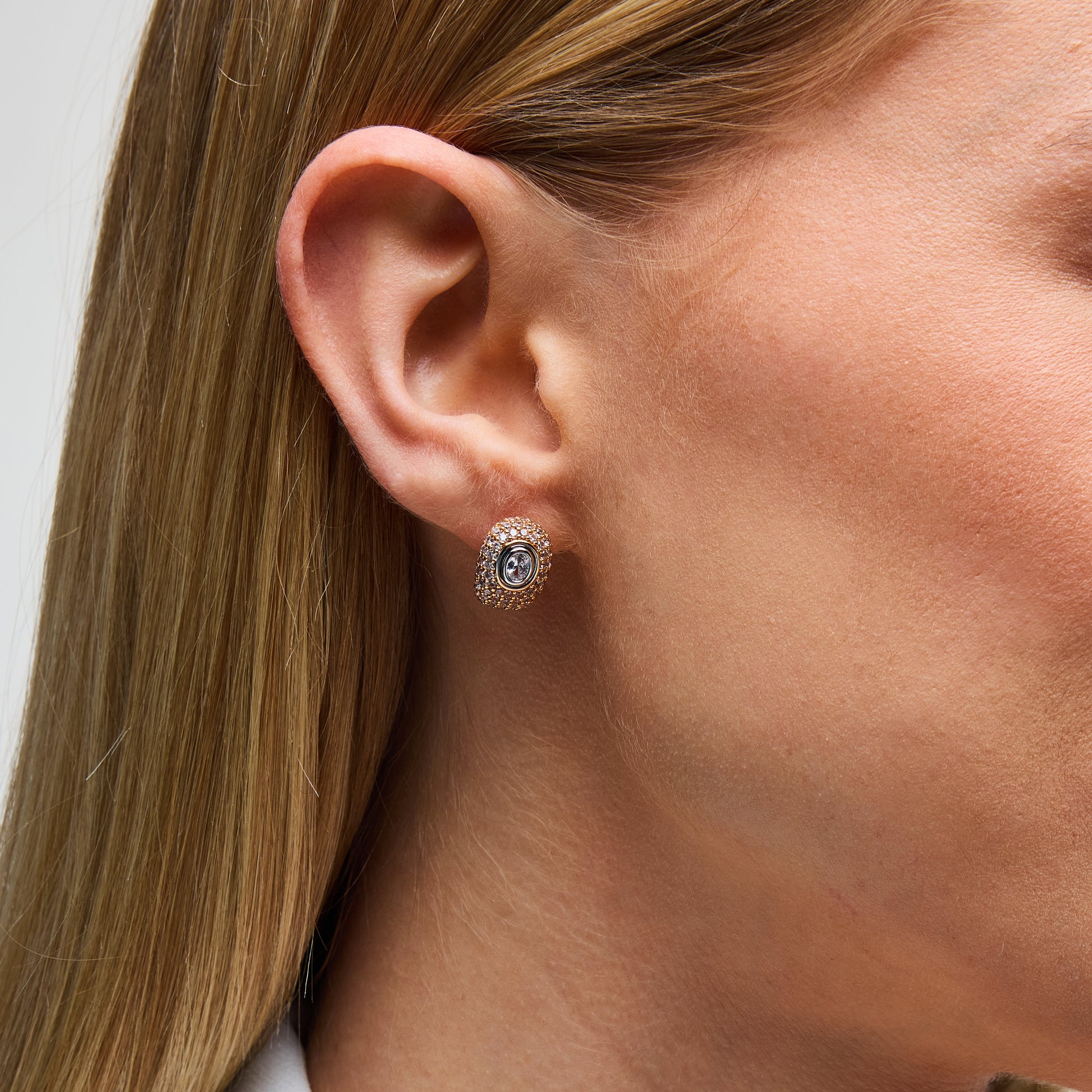Add a touch of glamour to your daily style with the Pave Jewelle Huggies, part of our exclusive collection with Luv AJ, only available at Rocksbox. These huggie earrings are crafted with 18k gold plating and adorned with rows of sparkling CZ crystals, creating a bold yet sophisticated look. A central CZ stone, framed in rhodium, adds an extra layer of luxe to this standout design. Perfect for dressing up any outfit or adding a little edge to your everyday, these huggies are a must-have for the modern jewelry lover.