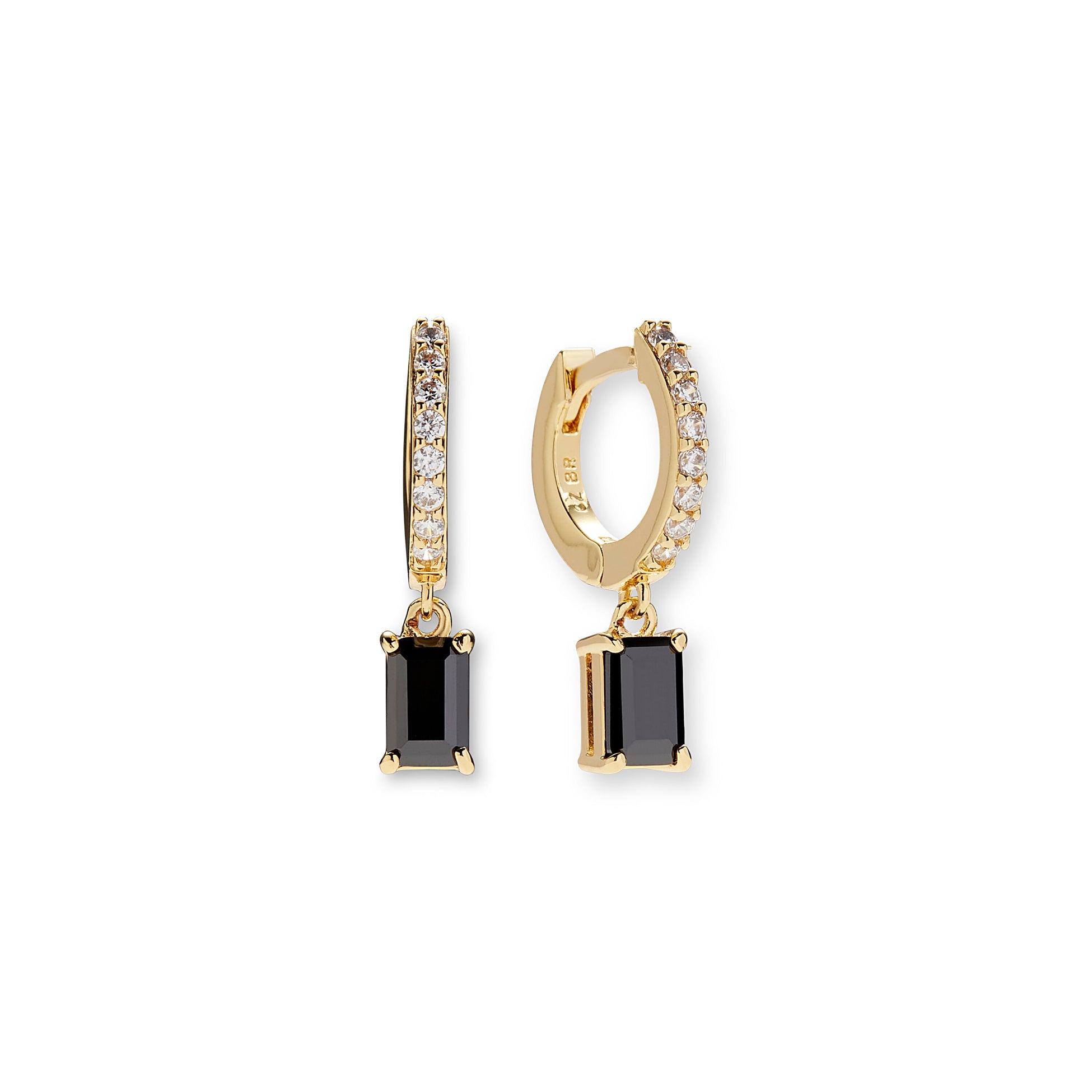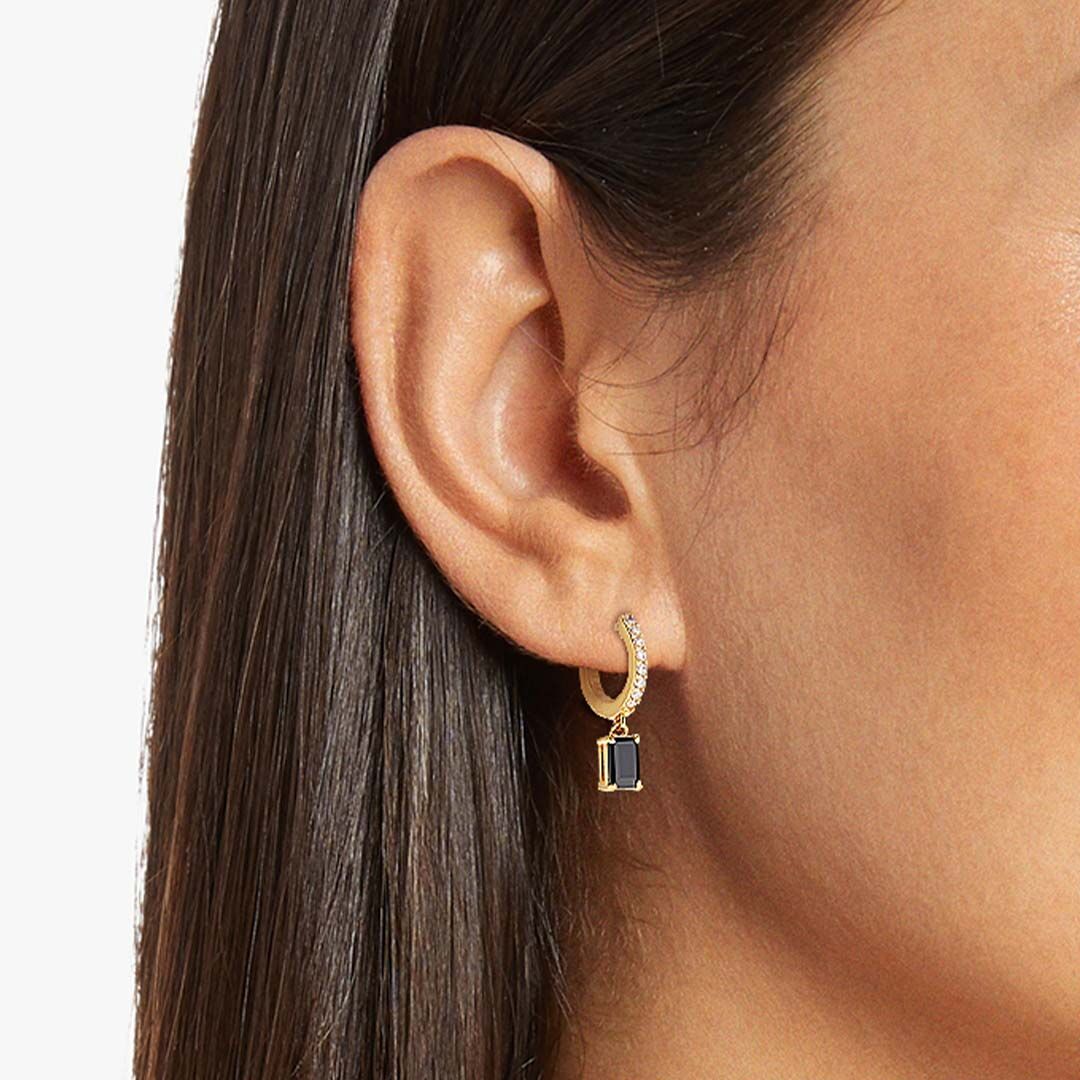 The Rocksbox Baguette Drop Huggies are high polish gold plated earrings that are 0.20" long. The pave small hoop holds a black baguette-cut charm.