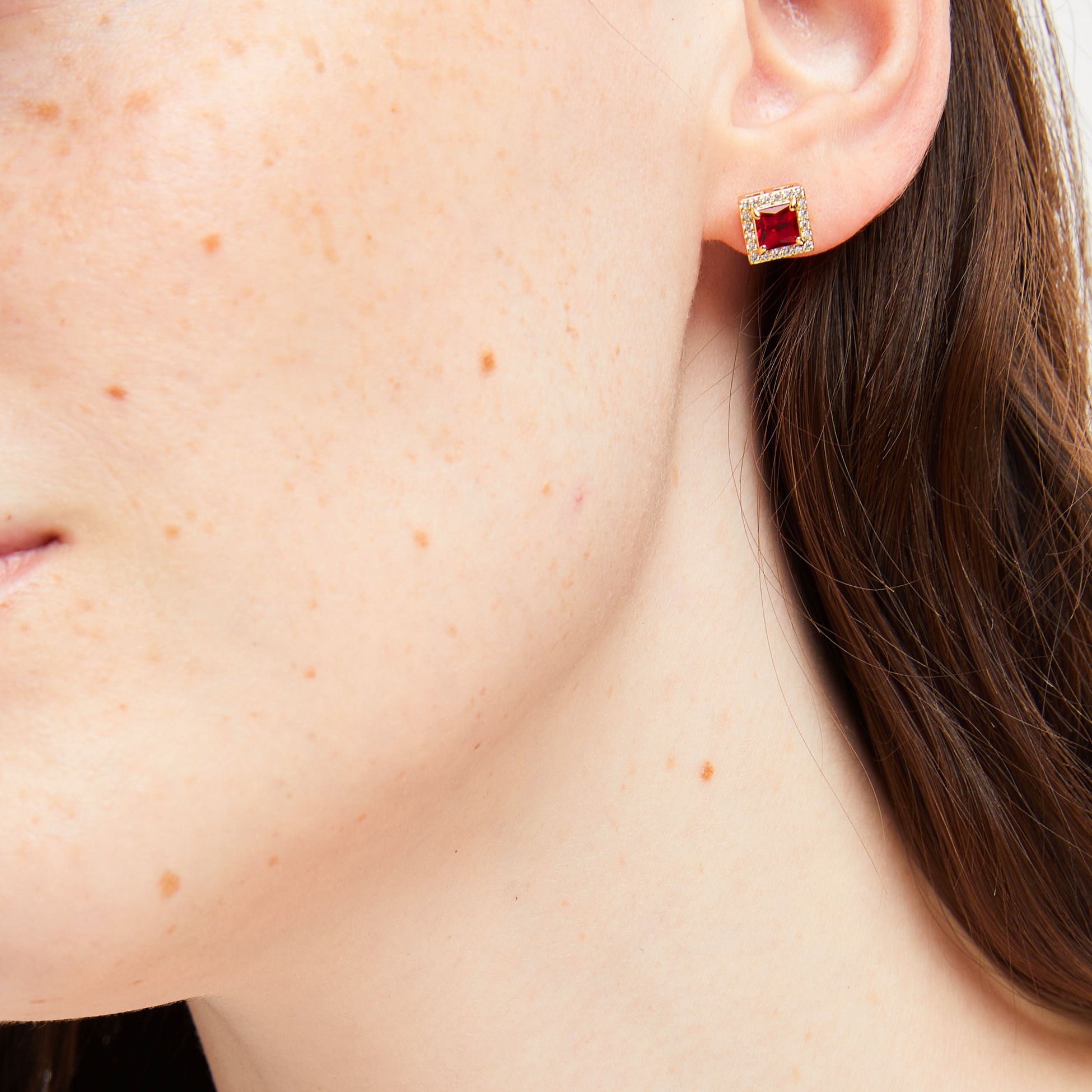 The Mini Square Kate Studs in Gold & Red by Rocksbox feature high polish, 14k gold-plating and a stunning, square ruby red CZ stone surrounded by pave. They measure 7mm with stainless steel post backs.