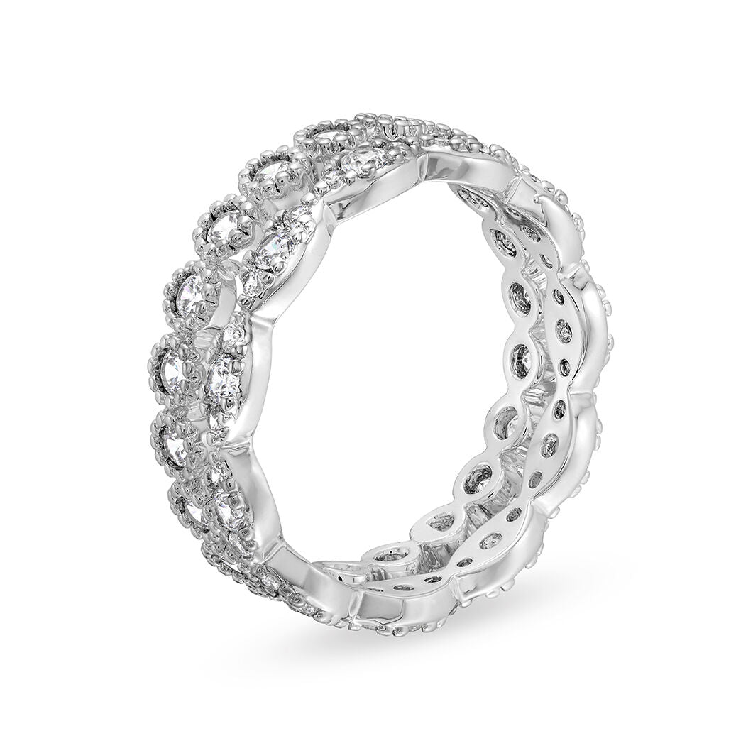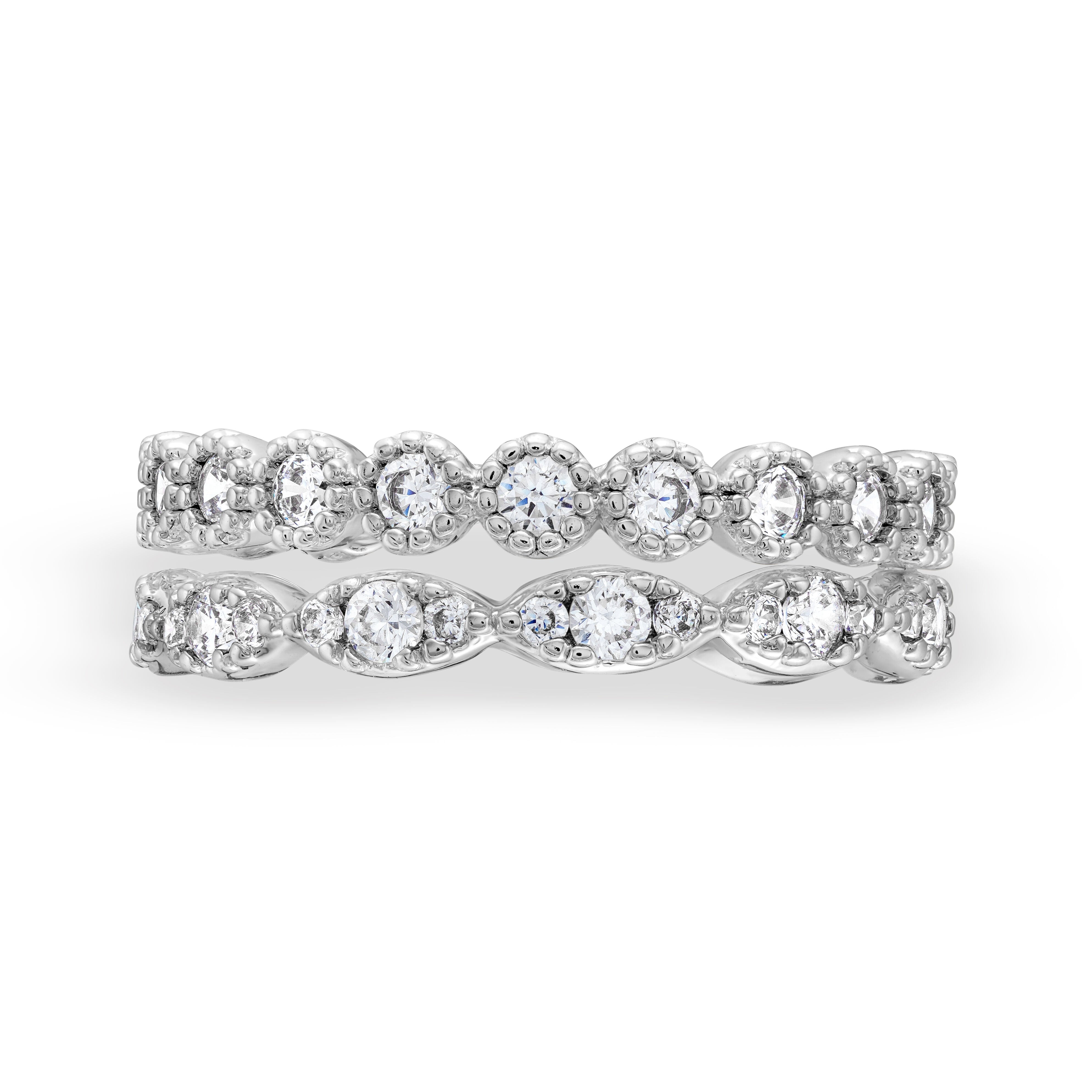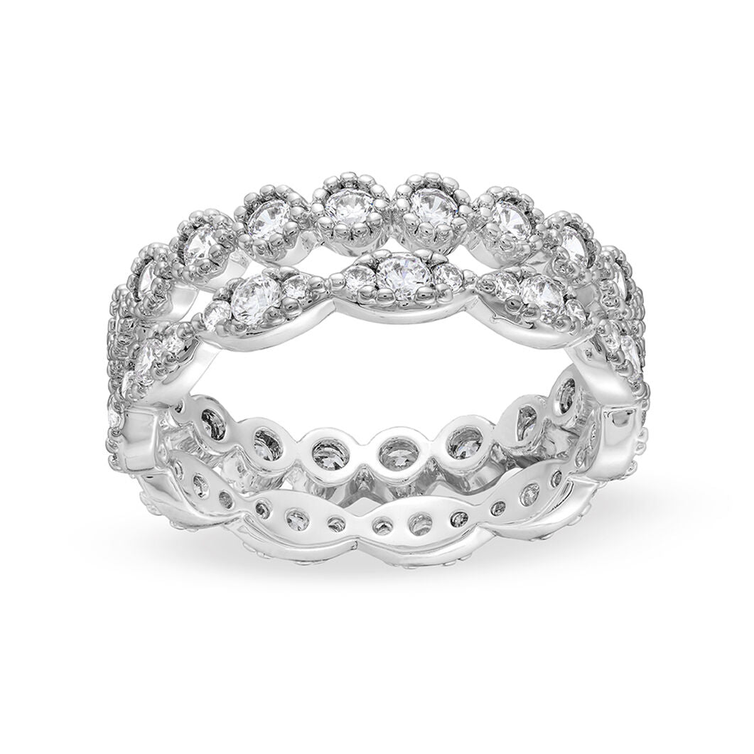 The Sophie Harper Pave & CZ Ring Set is a set of two high polish silver plated rings. This set is composed of two bands detailed by crystal pave, with one featuring round crystals around the band and the other band with crystals of varying sizes.
