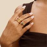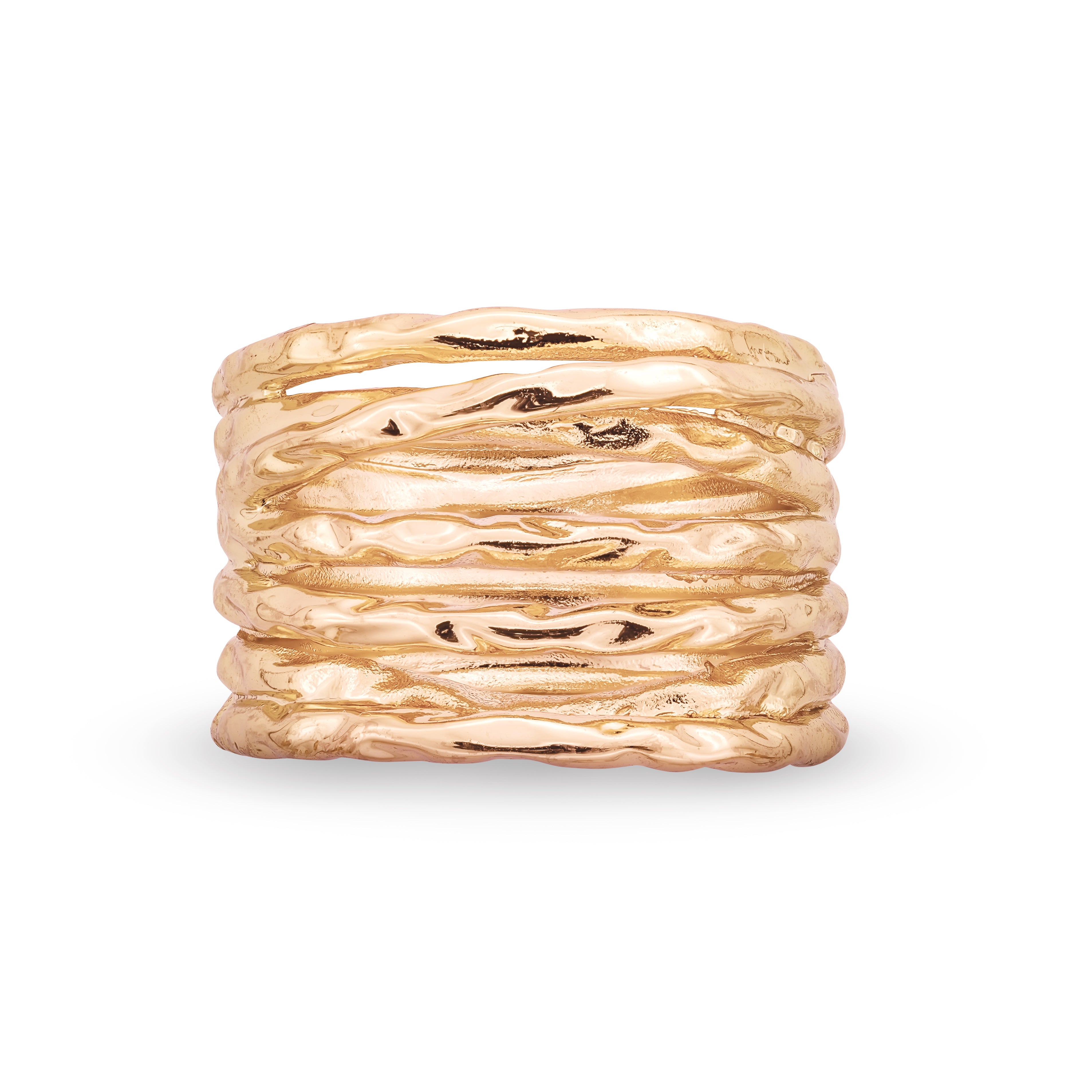 Bold and earthy, this hammered gold ring adds depth and effortless style with its layered design. Made with recycled materials and 14k gold plating, it's a part of Rocksbox’s mindful approach to jewelry.