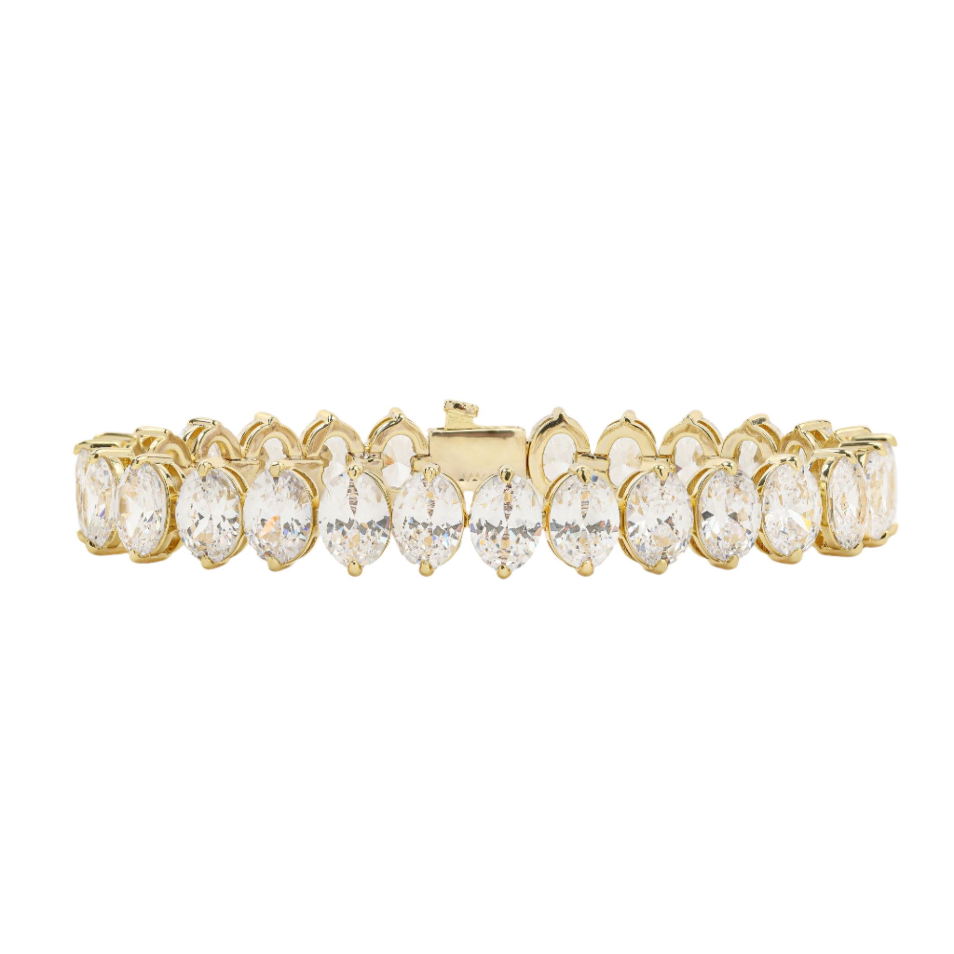 This classic, goes-with-everything tennis bracelet features brilliant gems set in 18k gold-plated brass. Stack it with delicate gold bracelets for unmatched sparkle and shine.