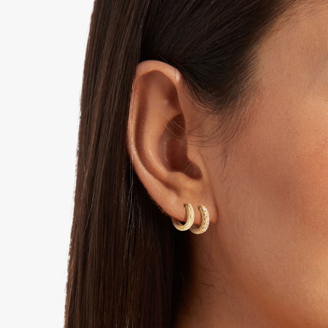 The Rocksbox Demi Fine Huggie Pack is a high polish 18k real gold plated over sterling silver. This set comes in two small huggies - the first pair is covered by crystal pave and the second pair has a smooth gold metal tone.