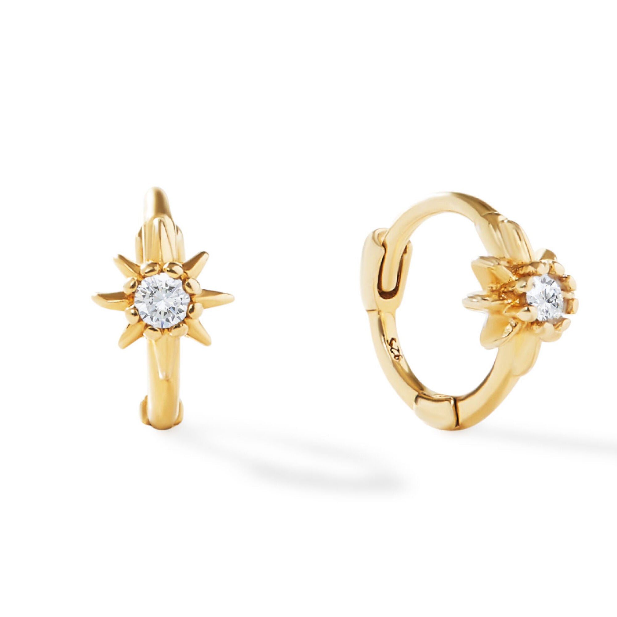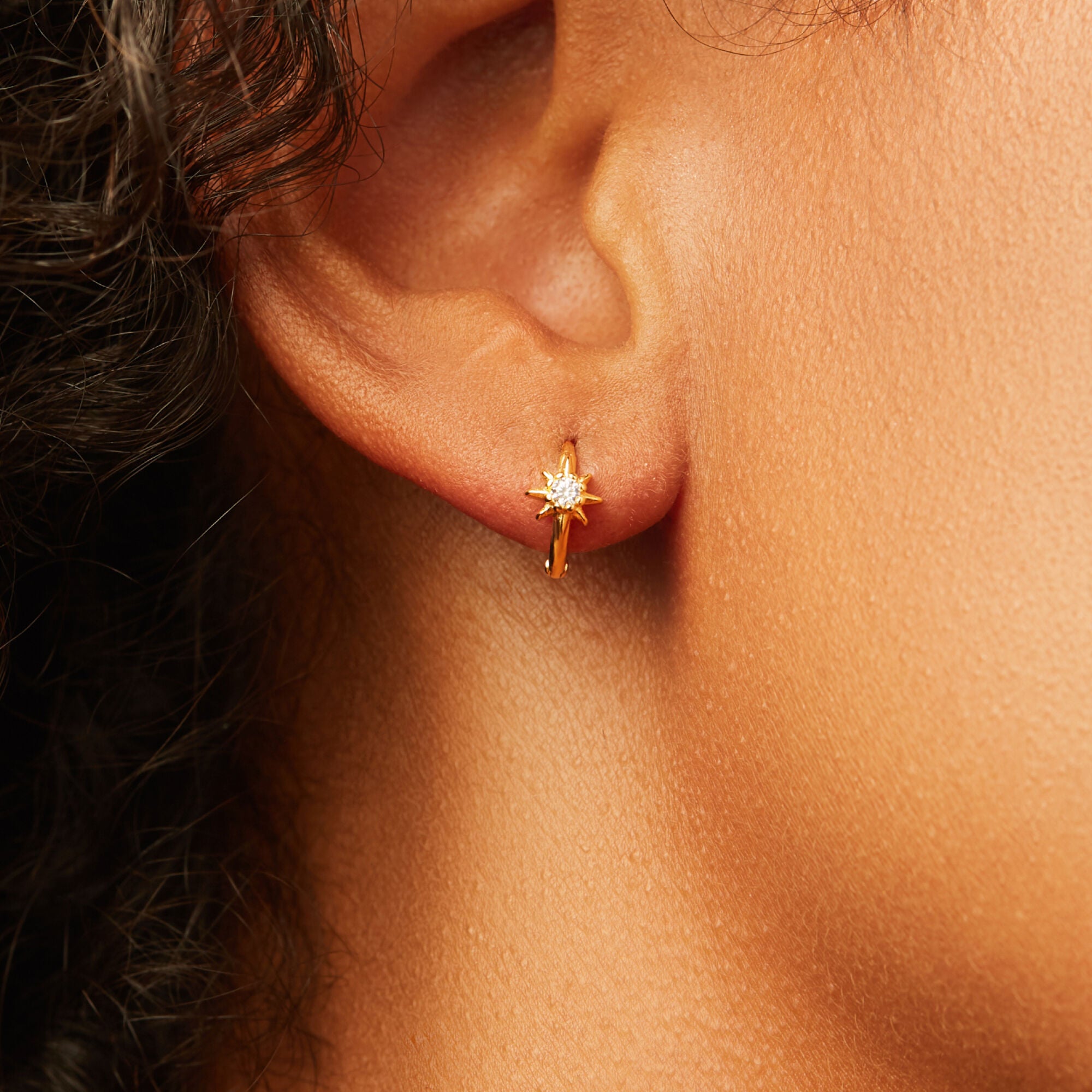 Shine brighter than the sun with these classy gold huggie hoops made of recycled Sterling Silver. Inspired by the fiery color play of the sun, these gold-plated huggie hoops feature a cubic zirconia gemstone that sparkles beautifully in the light. These huggie hoops are crafted in 100% recycled sterling silver and dipped in a thick gold layer that gives them a luxurious texture.
