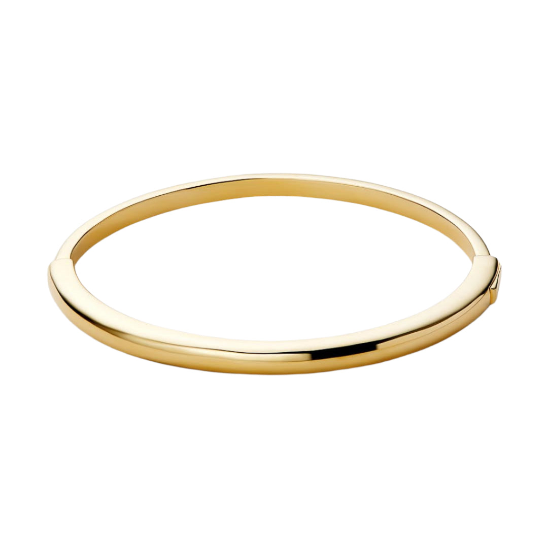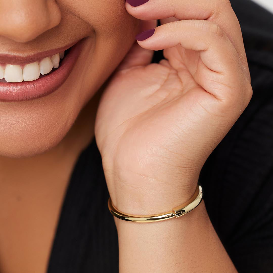The classic bangle, leveled up. Sleek and sculptural with just enough shine, the Brynley makes a strong case for less-is-more styling. Plated in 14k gold, this versatile bangle with a hinged clasp features a high-shine polished finish and simple design that’s perfect for adding to your everyday stack.