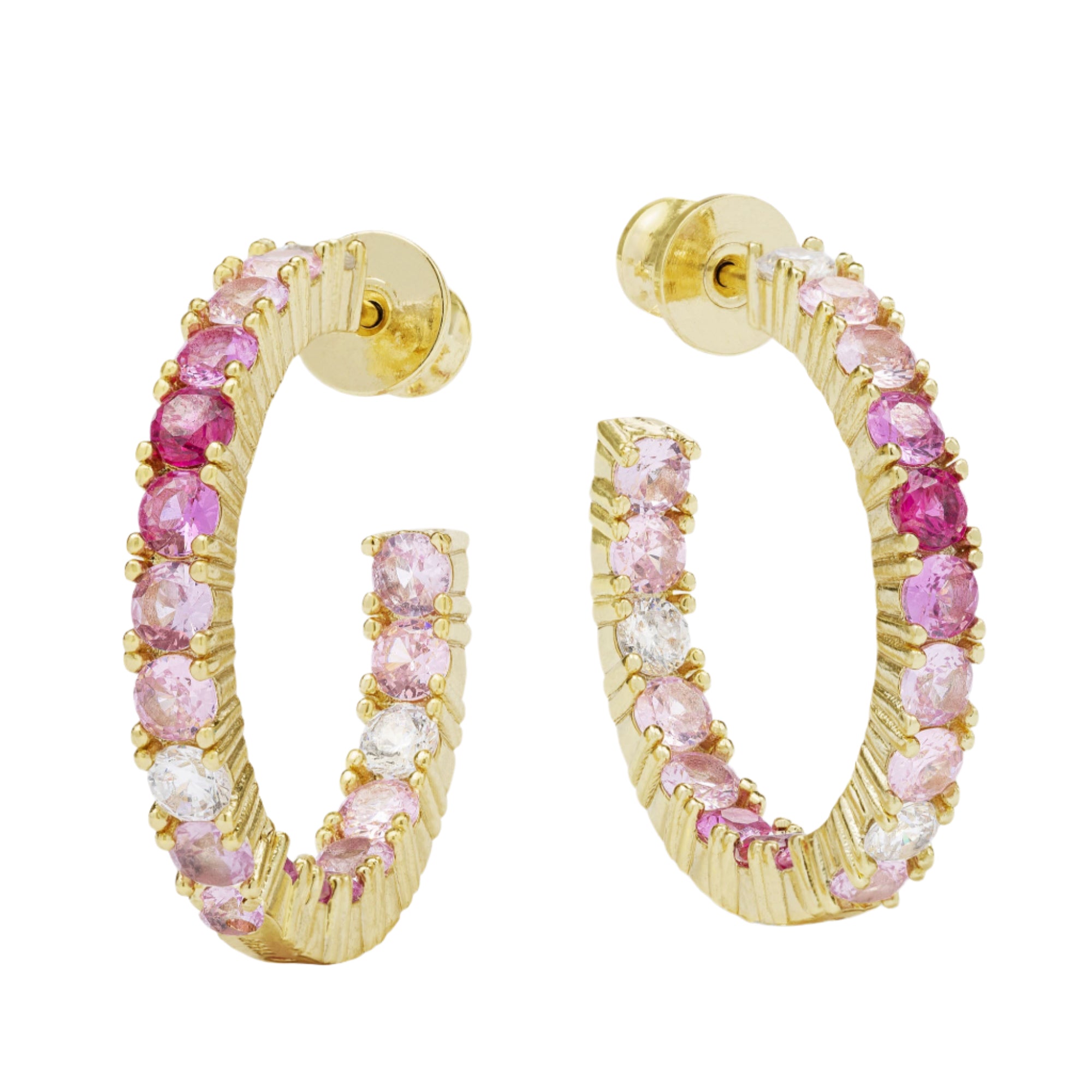 Designed by Melinda Maria, the Heiress Ombre Hoops bring high-wattage sparkle in a perfectly wearable size. Featuring pink ombré CZs set in 18k gold plating, these 1" hoops add a bold, feminine twist to any look—because subtle is overrated.