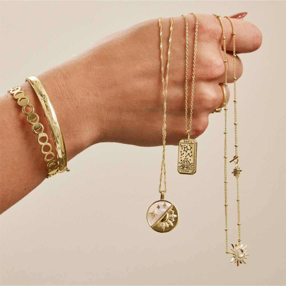 Meet the Midnight Hour Gold Bangle, a stunning sleek bracelet that features a sprinkling of mini celestial motifs etched around the band of the bracelet. This easy-to-wear bracelet features a seamless clasp that lets you style effortlessly even if you are on-the-go. The perfect bangle to uplift any look, layered or solo.