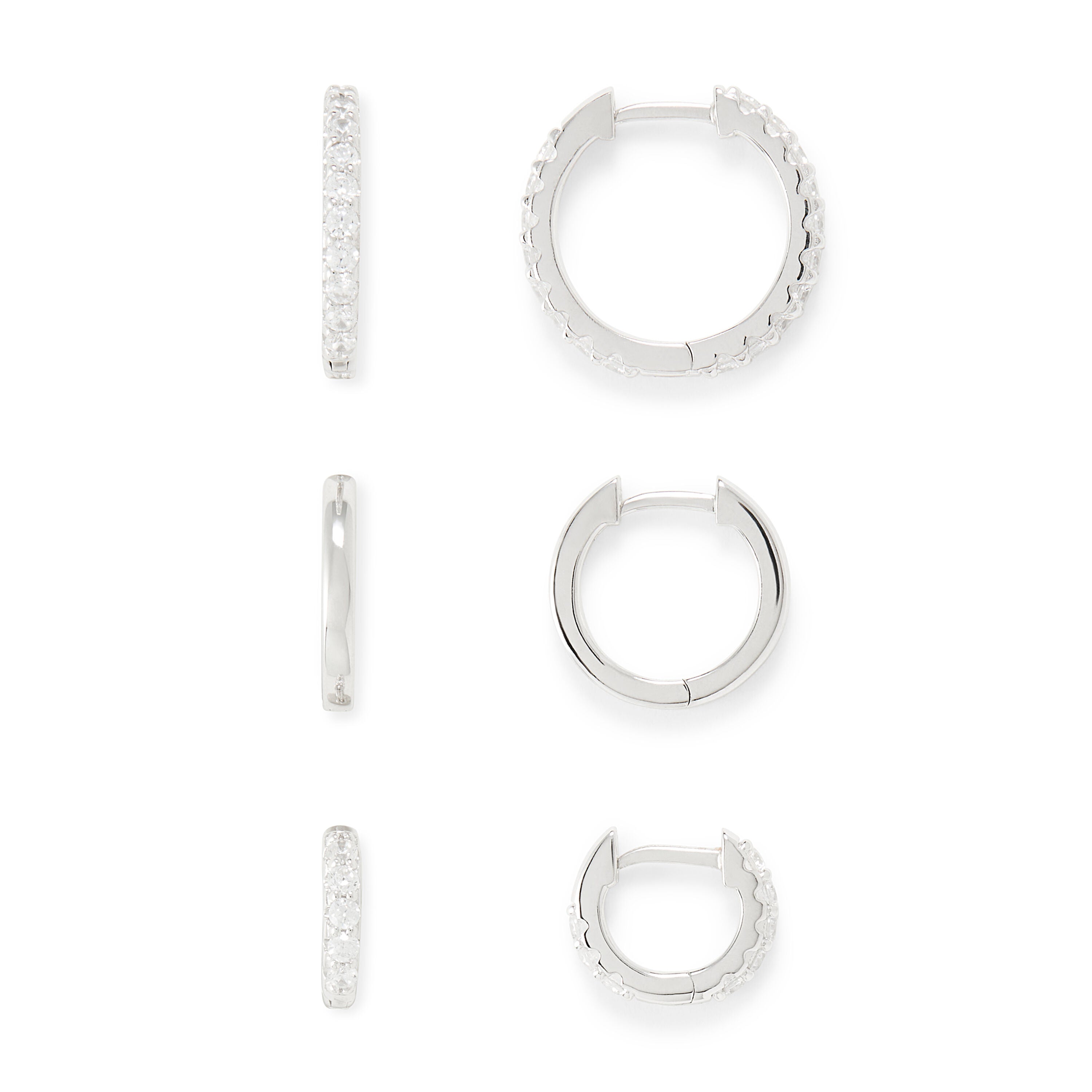 The Rocksbox Sterling Silver Huggie Ear Party Set is a set of three high polish, smooth hoop earrings in varied sizes, including one clear, pave pair. This set of earrings measures 10mm, 14mm and 23mm and are made with stainless steel earring post backs. Create an effortless everyday earring stack with the refined Sterling Silver Huggie Ear Party Set.