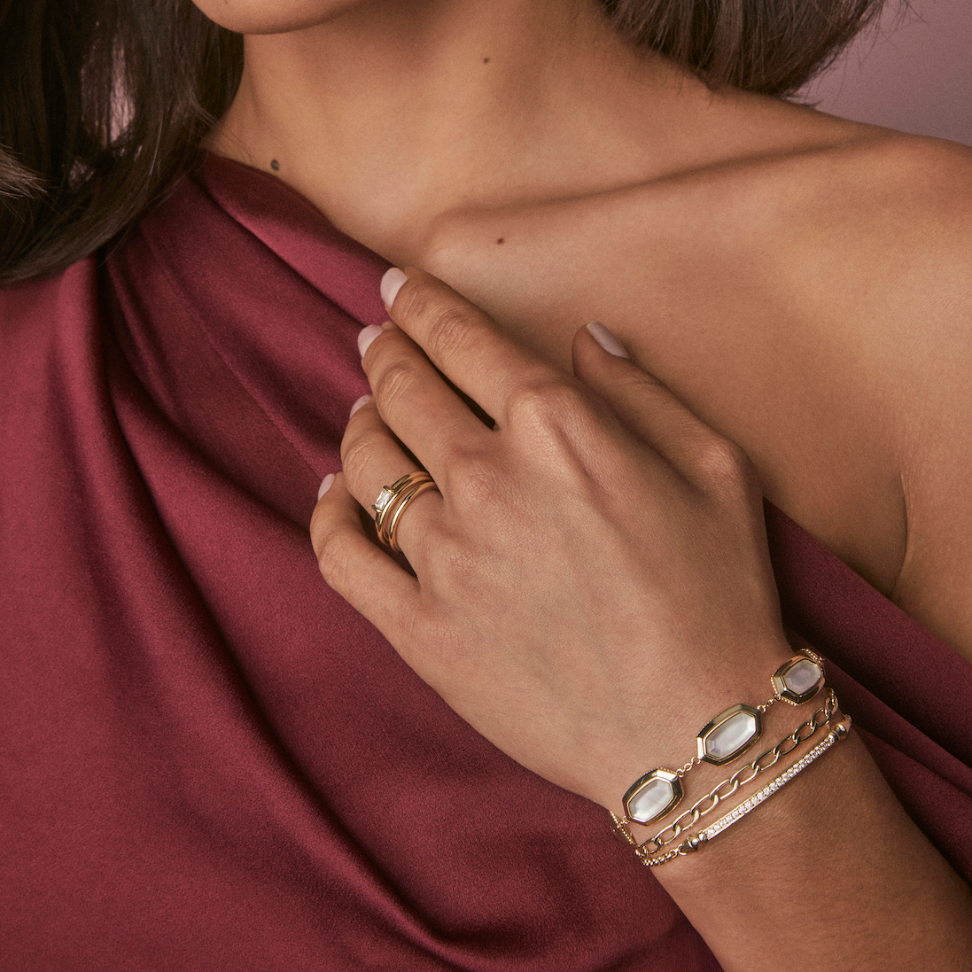 A soft shimmer moment. This adjustable bracelet features a delicate chain and a mother of pearl centerpiece that catches the light—just the right touch for every day.