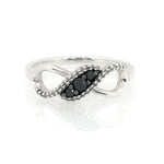 The Pre-Owned Jared Sterling Silver Black & Clear 1/5ct Diamond Twist Ring is a pre-owned luxury infinity ring made with black and white diamonds, size 7.