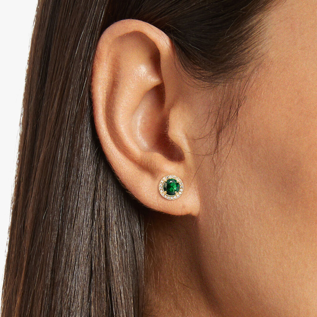 The Rocksbox Kate Studs in Green are high polish 14k gold plated earrings that are 9mm length. These round emerald studs are detailed by white crystals.