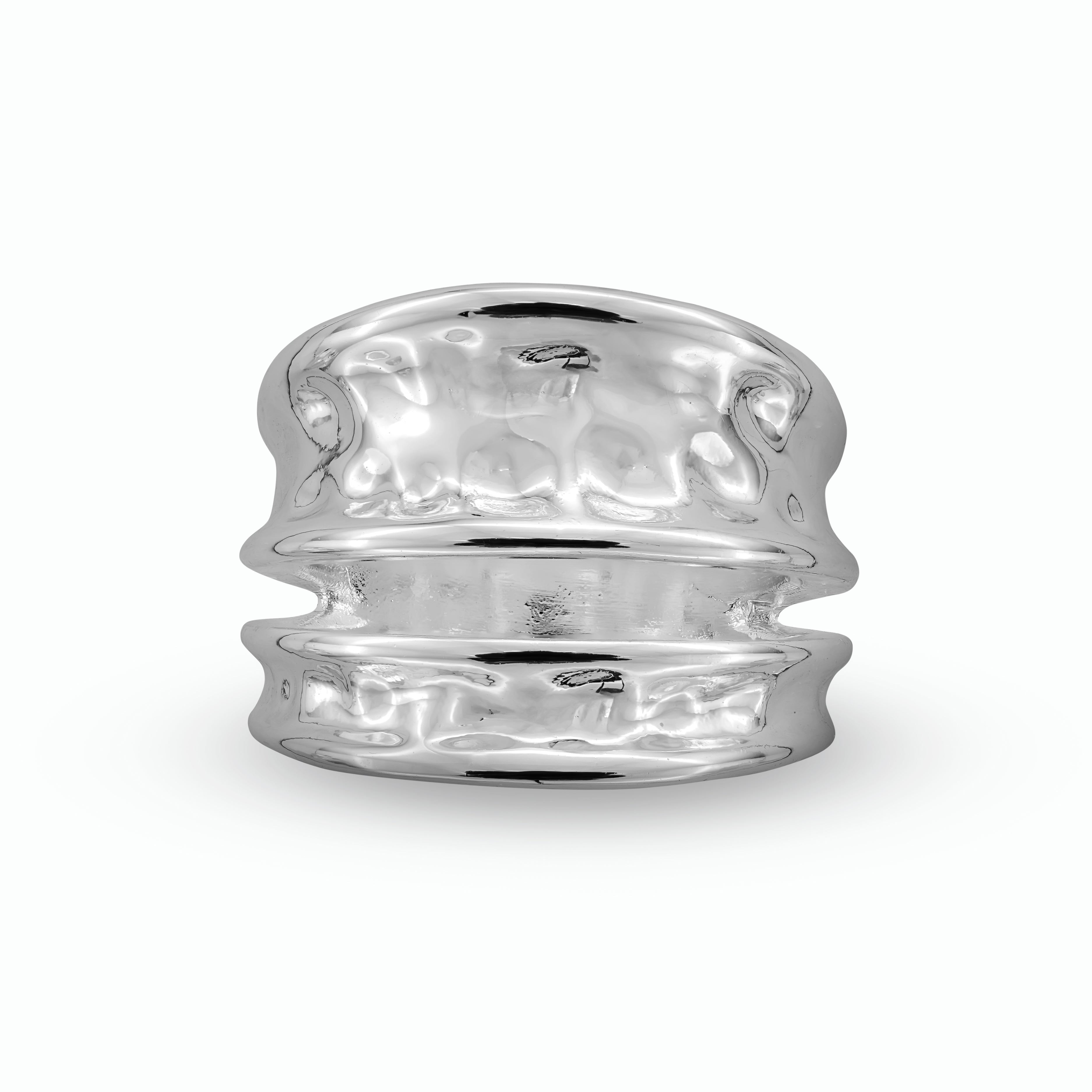 Stand out with this bold silver ring, inspired by the raw beauty of natural forms. Crafted with a conscious approach, this piece features recycled materials and a striking silver finish.