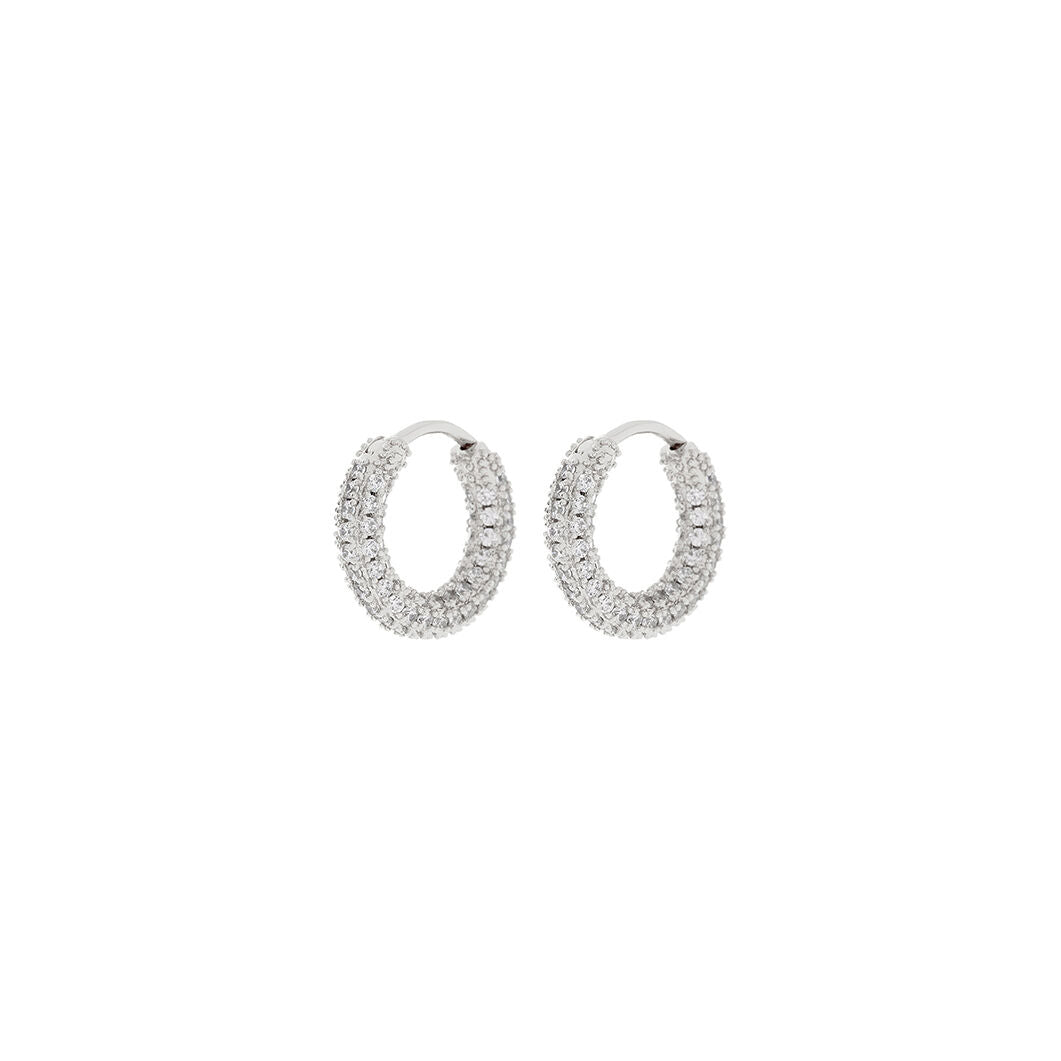 The Luv AJ Pave Amalfi Huggies are high polish silver plated earrings that are 0.55" long. These small circular pieces are surrounded by dazzling crystal pave.