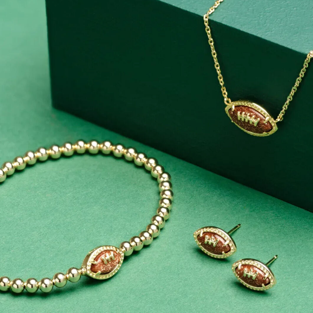 Turn the stands into a runway when you style the Football Gold Stud Earrings in Orange Goldstone. Framed by Kendra Scott's signature detailing, these sporty studs shimmer with their glimmering orange goldstone. Go for an extra spirited look when you style these studs with the Football Short Pendant Necklace or Football Stretch Bracelet.