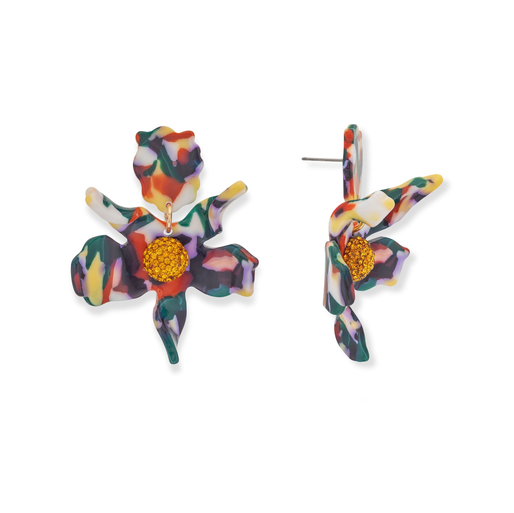 Lele Sadoughi's Small Crystal Lily Earrings in Harvest Multi are the go-to accessory for a bold and bright look. These earrings feature high polish, 14k gold-plating with colorful resin.