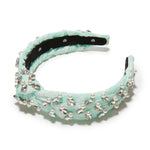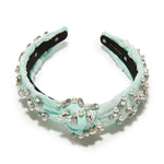 Wrapped in delicate fabric and meticulously hand-set with faux pearls and CZ, this 1 1/2-inch headband is a statement piece with a sweet twist.